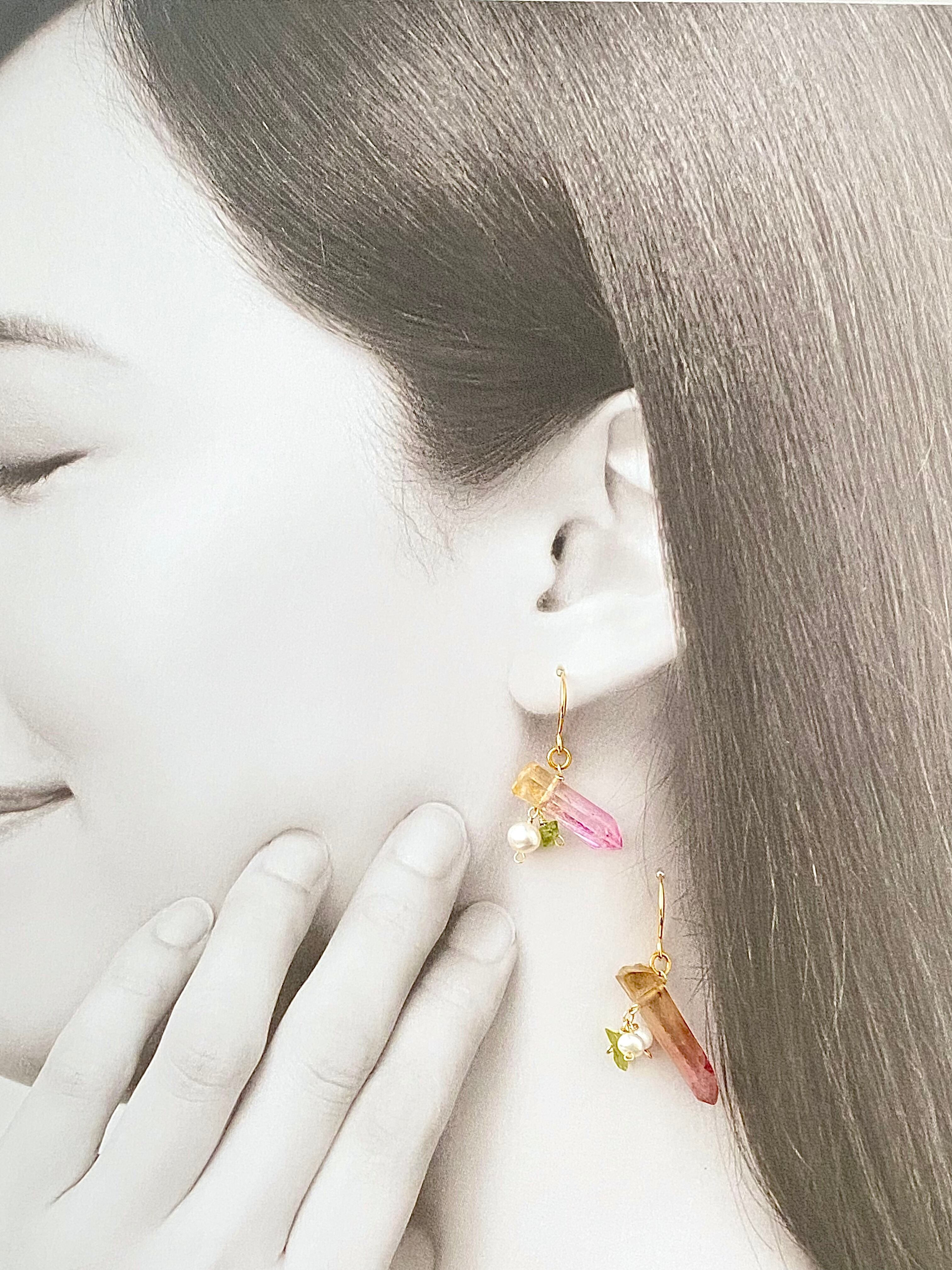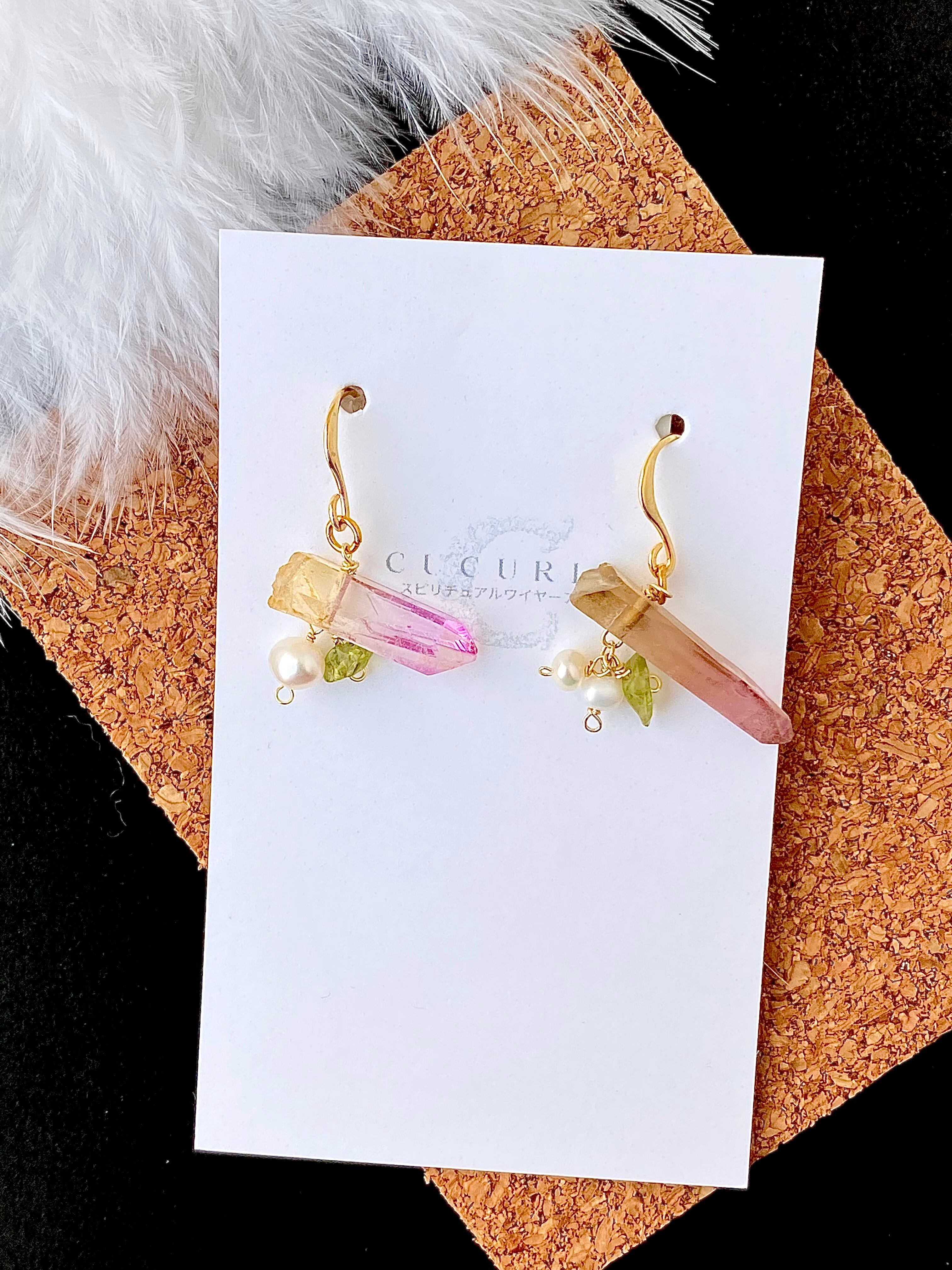 ピンクオーラ水晶・ペリドット・淡水パールアシンメトリーピアス/イヤリング
